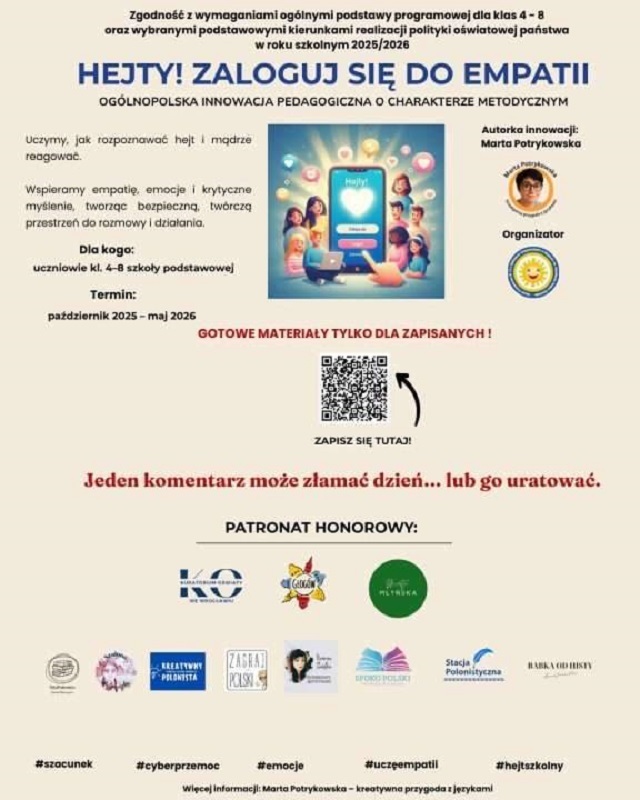 „Hejty! Zaloguj się do empatii” – ogólnopolska innowacja pedagogiczna ucząca rozpoznawania hejtu, reagowania z empatią i budowania kultury szacunku w sieci i w szkole. Projekt rozwija emocjonalną inteligencję uczniów i wspiera nauczycieli w działaniach wychowawczych.