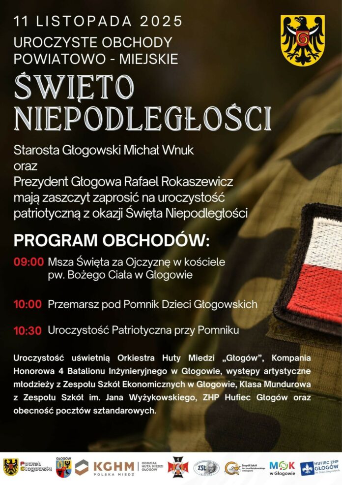 W tym roku 11 listopada przypada we wtorek. Uroczyste obchody miejsko-powiatowe rozpocznie tego dnia msza święta za Ojczyznę w kościele Bożego Ciała (godz. 9:00). Po mszy, około godz. 10:00 zaplanowany jest przemarsz pod Pomnik Dzieci Głogowskich, gdzie o godz. 10:30 odbędą się oficjalne uroczystości.